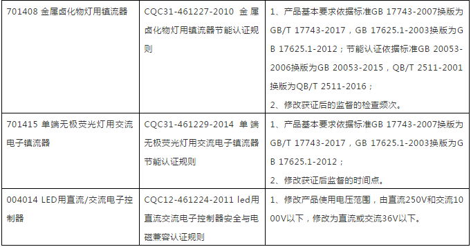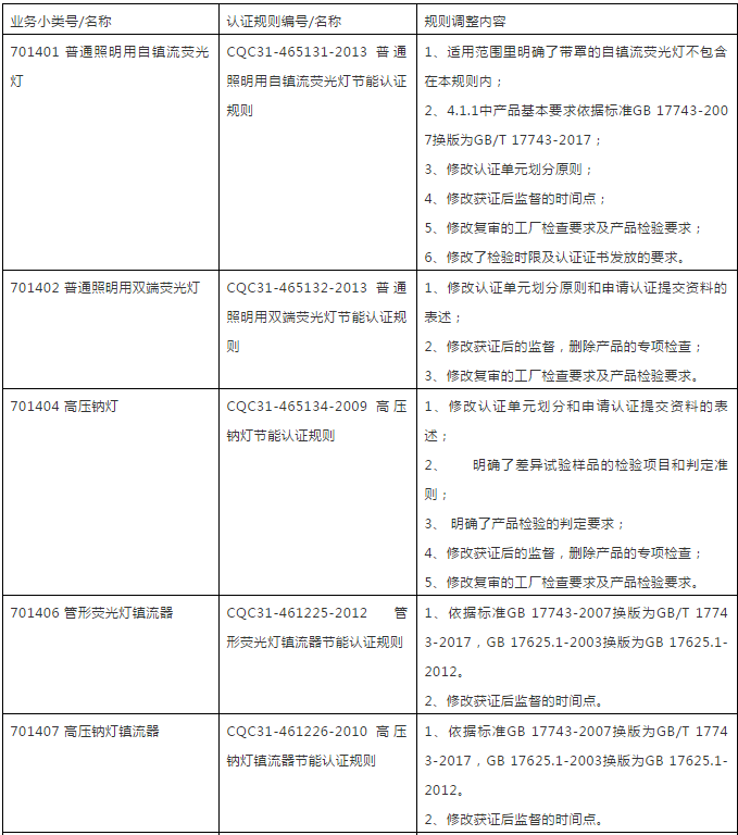 中国质量认证中心(英文缩写CQC)于近日对《普通照明用自镇流荧光灯节能认证规则》等规则进行了修订,具体修订涉及规则及要求如下: