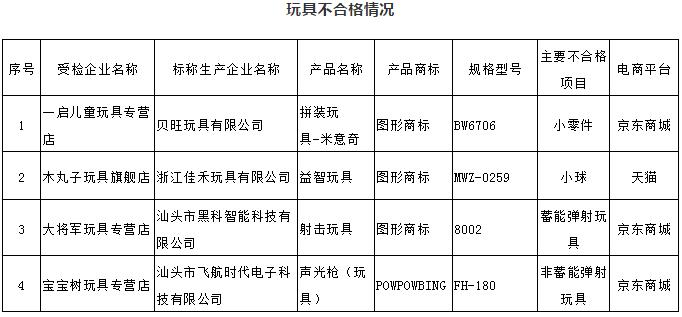 玩具共抽取161批次,有61批次没有标明生产厂厂名和厂址,违反《产品质量法》要求,有14批次涉嫌未经CCC认证。对其余86批次产品进行检验,重点检验了机械与物理性能、易燃性能、特定元素的迁移、增塑剂等四大类项目。经检验,有4批次不合格,不合格项目涉及小零件、小球、蓄能弹射玩具、非蓄能弹射玩具。