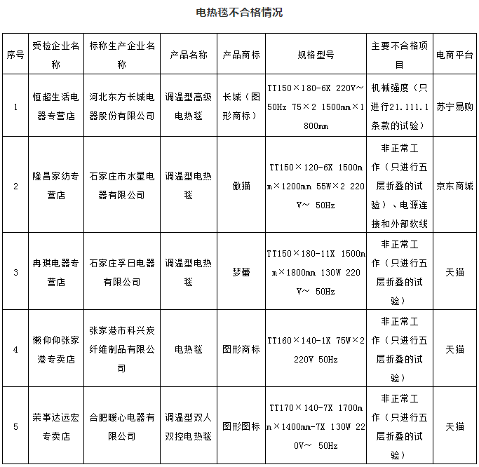 电热毯共抽取34批次,有4批次没有标明生产厂厂名和厂址,违反《产品质量法》要求,有6批次涉嫌未经CCC认证。对其余24批次产品进行检验,重点检验了对触及带电部件的防护,输入功率和电流,耐潮湿,泄漏电流和电气强度,非正常工作(只进行5层折叠的试验),机械强度(只进行21.111.1条款的试验),结构(不包括22.46条的试验),电源连接和外部软线,电气间隙、爬电距离和固体绝缘等9个项目。经检验,有 5批次不合格,不合格项目涉及非正常工作(只进行5层折叠试验),机械强度(只进行21.111.1条款的试验),电源连接和外部软线。