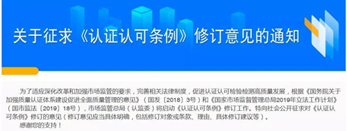 近日,市场监管总局(认监委)将启动《认证认可条例》修订工作,认监委官网已发布星空真人征求《认证认可条例》修订意见的通知,并特向社会公开征求对《认证认可条例》修订的意见(修订意见应当具体明确,包括修订对象或条款、理由、具体修订建议等)。