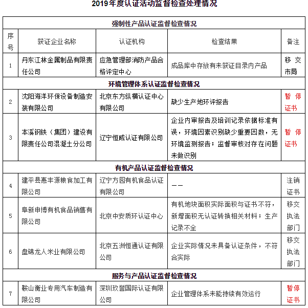 辽宁市场监管局发布2019年认证监督检查结果