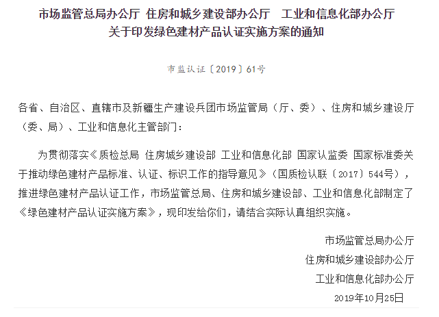 近日,市场监管总局、住房和城乡建设部、工业和信息化部制定了《绿色建材产品认证实施方案》,详情如下: