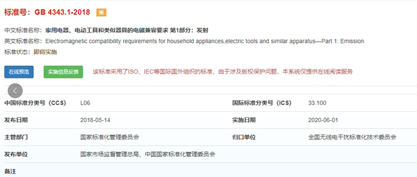 2020年6月1日起,标准号GB 4343.1-2018《家用电器、电动工具和类似器具的电磁兼容要求第1部分:发射》将强制实施。