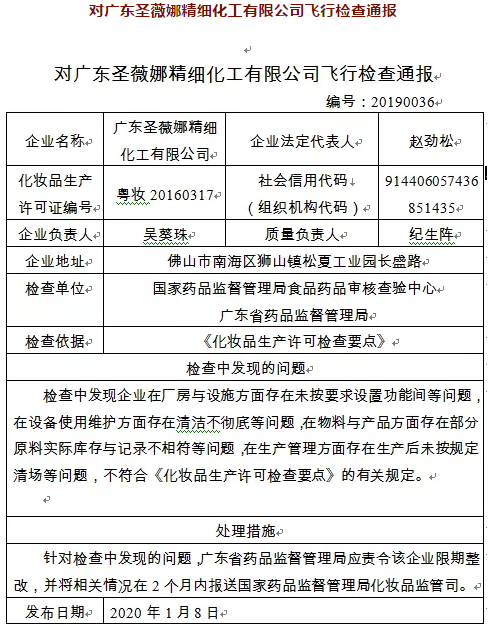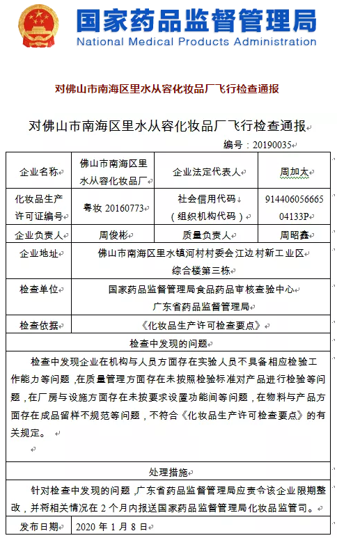 近日,国家药品监督管理局组织对佛山市南海区里水从容化妆品厂、广东圣薇娜精细化工有限公司进行了飞行检查,并通报了检查结果。
