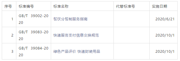 近日,国家市场监督管理总局(国家标准化管理委员会)批准发布《绿色产品评价 快递封装用品》等3项国家标准,详细如下: