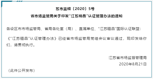 为规范“江苏精品”认证活动,维护“江苏精品”品牌形象,推动江苏省经济社会高质量发展,2020年8月21日江苏省市场监督管理局印发《“江苏精品”认证管理办法》。