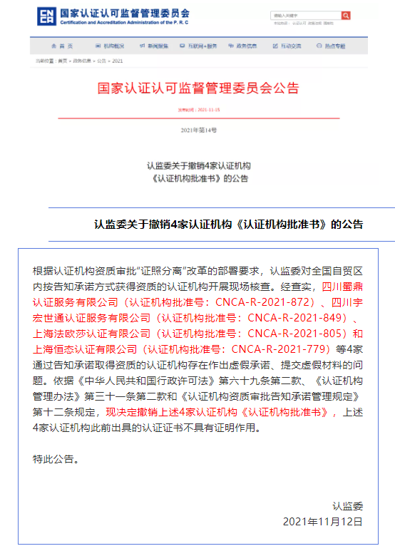 近日,国家认证认可监督管理委员会(CNCA)发布公告,4家通过告知承诺取得资质的认证机构因存在作出虚假承诺、提交虚假材料的问题被撤销《认证机构批准书》,4家认证机构此前出具的认证证书不具有证明作用。