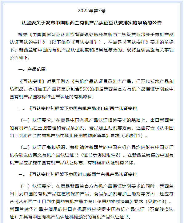 >> 认监委星空真人发布中国新西兰有机产品认证互认安排实施事项的公告