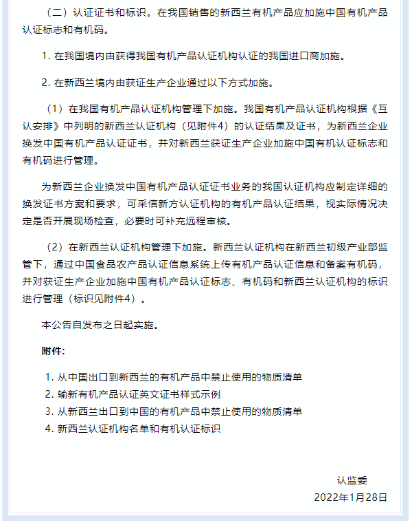 认监委星空真人发布中国新西兰有机产品认证互认安排实施事项的公告