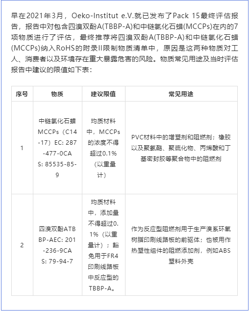 今年5月,欧盟委员会在其官方网站公开了一项针对RoHS指令限制物质的提案程序(Initiative)。提案计划将四溴双酚A(TBBP-A)和中链氯化石蜡(MCCPs)加入RoHS限制物质清单中。届时,欧盟RoHS限制物质将可能增至12项。