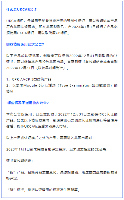 近日,英国商业、能源和工业战略部(BEIS)发布最新公告,发布了产品符合性标识UKCA(UK Conformity Assessed)实施指南的一系列变化,涉及包括GAR燃气产品、PPER个人防护用品、RER无线广播设备、MER测量仪器设备、PER压力设备、Lift Regulation电梯、CPR建筑产品等诸多在英格兰、苏格兰和威尔士(英国大不列颠地区)市场上售卖的大多数产品。