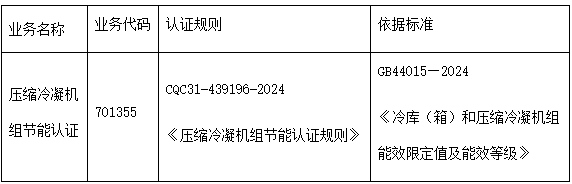 中国质量认证中心(英文缩写CQC)研发并推出了压缩冷凝机组节能认证业务,具体信息如下: