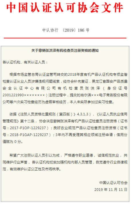 近日,中国认证认可协会(CCAA)发出通知,因提供虚假实习检查经历,张洪泽被撤销有机检查员注册资格。