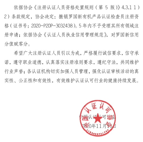 近日,中国认证认可协会发布通知,决定撤销罗国新有机产品认证检查员注册资格(证书号:2020-P2OP-3032438)。5 年内不予受理其所有领域注册申请。详情如下: